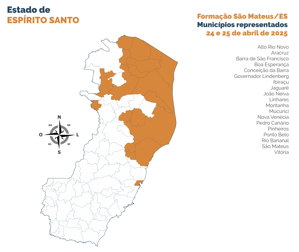 No dia 24/04, participaram gestores/as dos municípios de Aracruz, Ibiraçu, João Neiva, Linhares, Rio Bananal, Sooretama, Nova Venécia, Pinheiros, Alto Rio Novo e Vila Pavão. Já no dia 25/04, a formação atendeu representantes de Boa Esperança, Conceição da Barra, Jaguaré, Montanha, Mucurici, Pedro Canário, Pinheiros, Ponto Belo, São Mateus, Bananal, Vitória e Venda Nova do Imigrante, reafirmando o compromisso regional com o fortalecimento da gestão escolar.